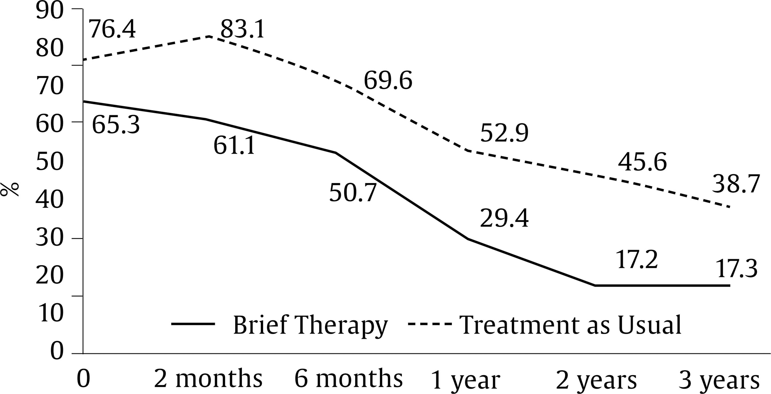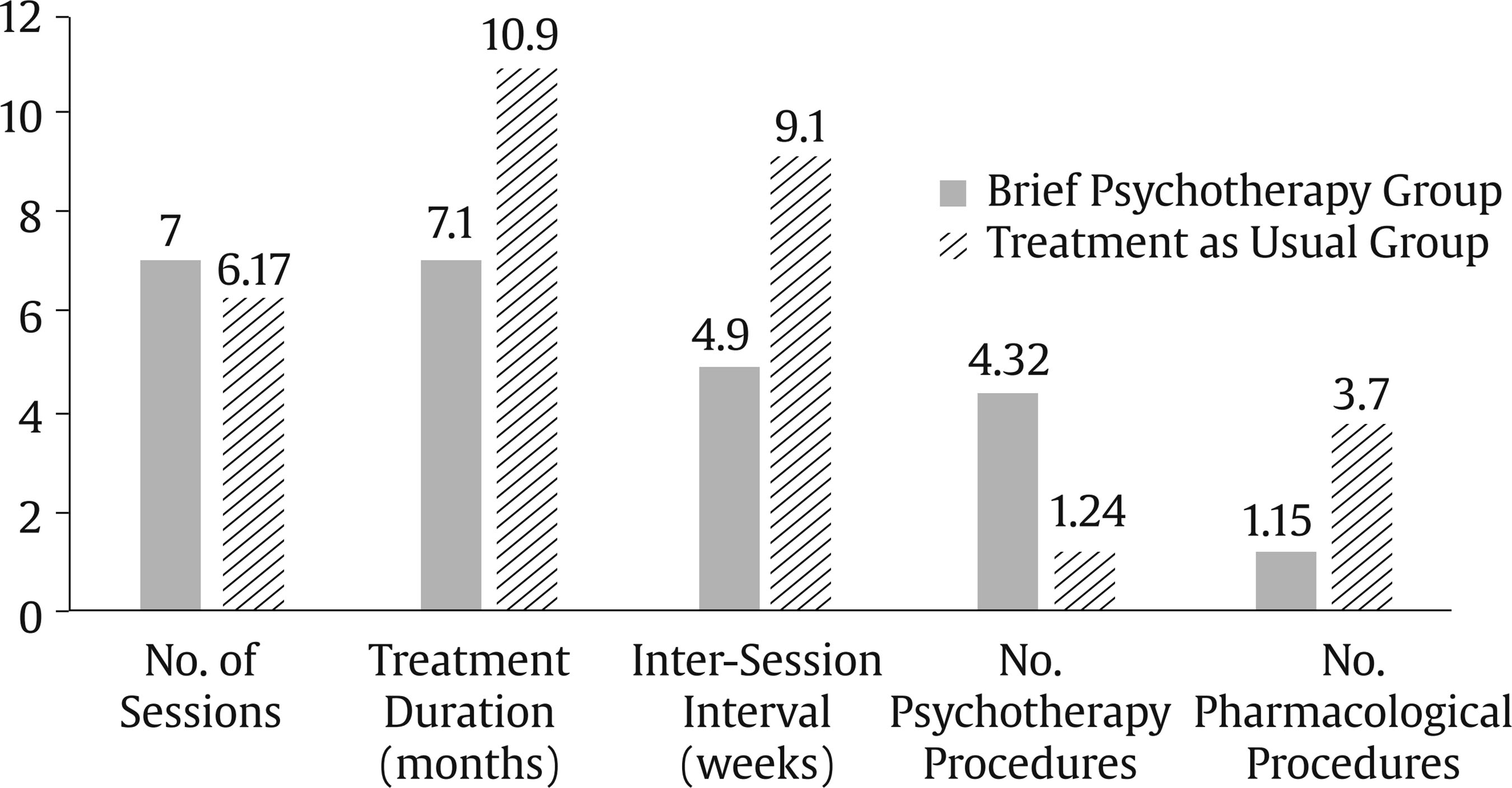 At the end of the three years, the mean duration of the brief psychotherapy program was 213 days (Mdn = 170), with an average of 7 sessions (Mdn = 5.5). Intersession interval was 34.29 days (Mdn = 31.37). Psychological treatment was the predominant procedure in 82% of cases.