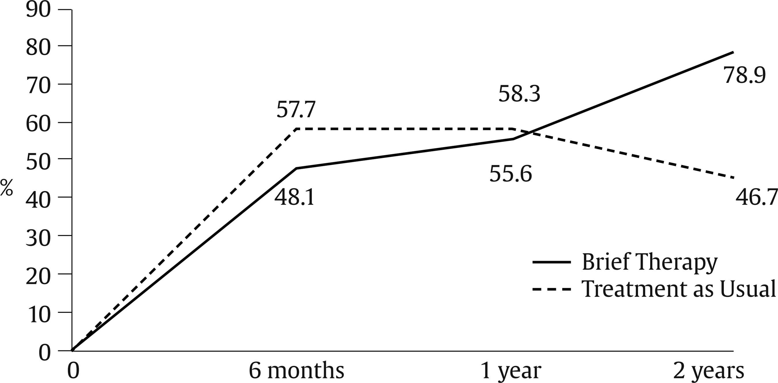 Although the main goal of our work was to study the effectiveness of brief psychotherapy, one of the main conclusions refers to the effectiveness of psychopharmacological treatments and how its effectiveness is not sustained over time. Data points to something highly relevant and underresearched, which is that the positive effect of psychoactive drugs progressively diminishes after six months, although this is not usually reflected in studies on the effectiveness of psychopharmacological and psychological treatments, because most of them focus on short-term results and do not carry out subsequent follow-ups (González-Pardo & Pérez-Álvarez, 2007; Smith, 2005).