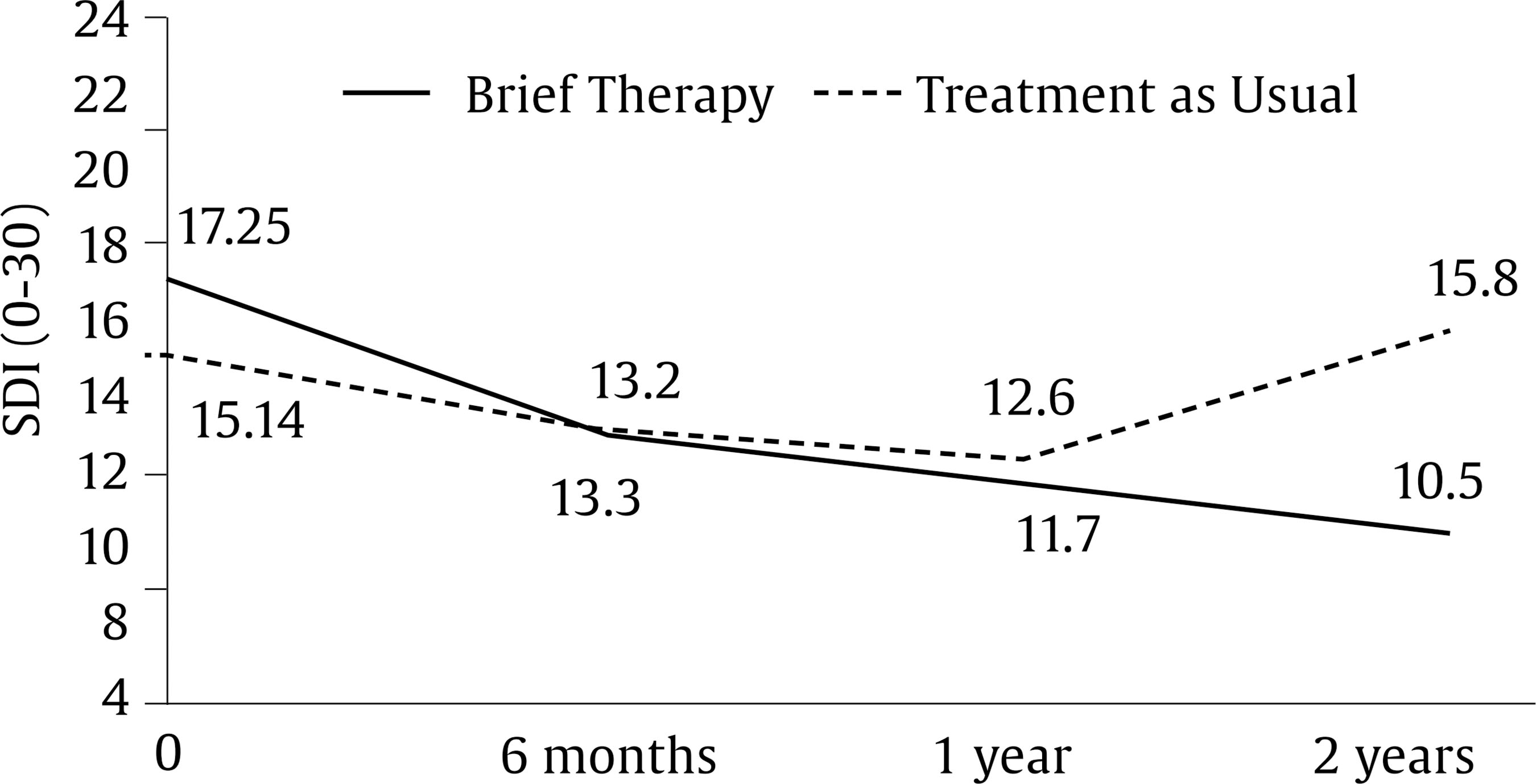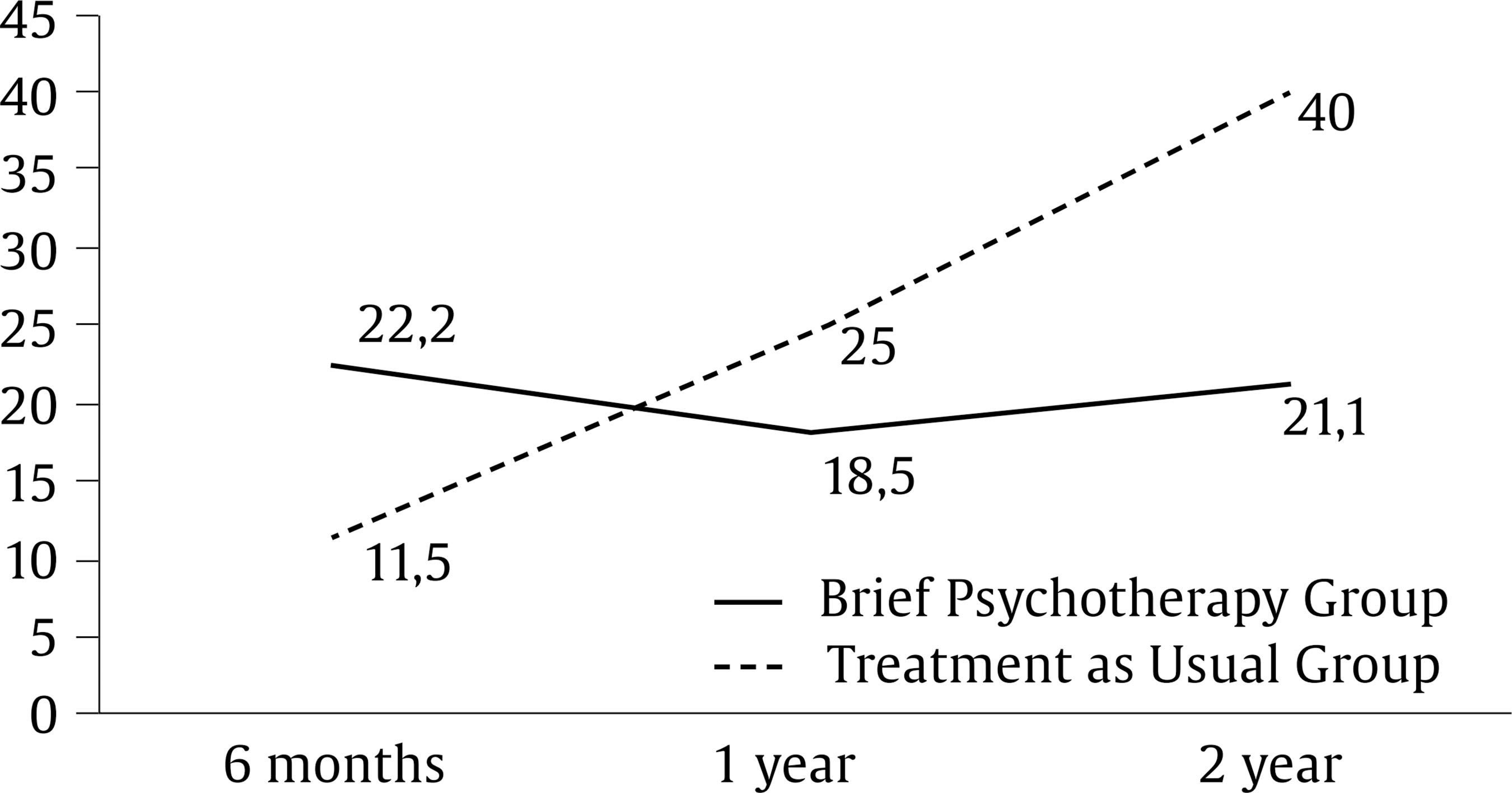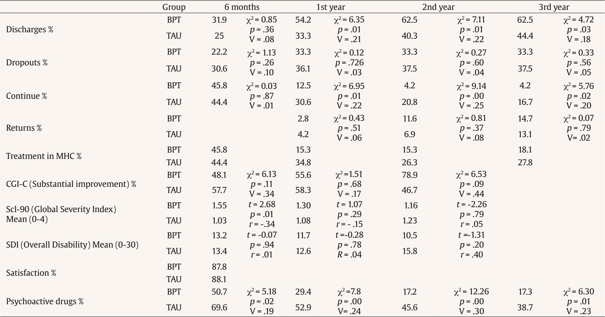 We compare the results presented mainly with those of the IAPT project as, although it is not an RCT, it is a study in the public context and the size and standardization of the results makes it highly valid. In the IAPT, the clinical significance of improvement in patients is higher in terms of symptomatology reduction than at the functional level and quality of life level (Knapstad et al., 2020; Wakefield et al., 2020), although they do not report results of over a year. In our RCT, during this time frame, the BPT achieved rather modest improvements at the symptomatological and functional levels. Even symptomatological improvements are almost non-existent in the first 3-6 months, and certainly less than in the TAU and in the outcomes reported in the IAPT (Clark, 2018). It is at two years that a significant clinical and functional improvement is identified, although, due to the high sample loss of psychometric data in this time period, we must be very cautious and analyze the consistency with other more objective outcomes, such as psychotropic drugs consumption.