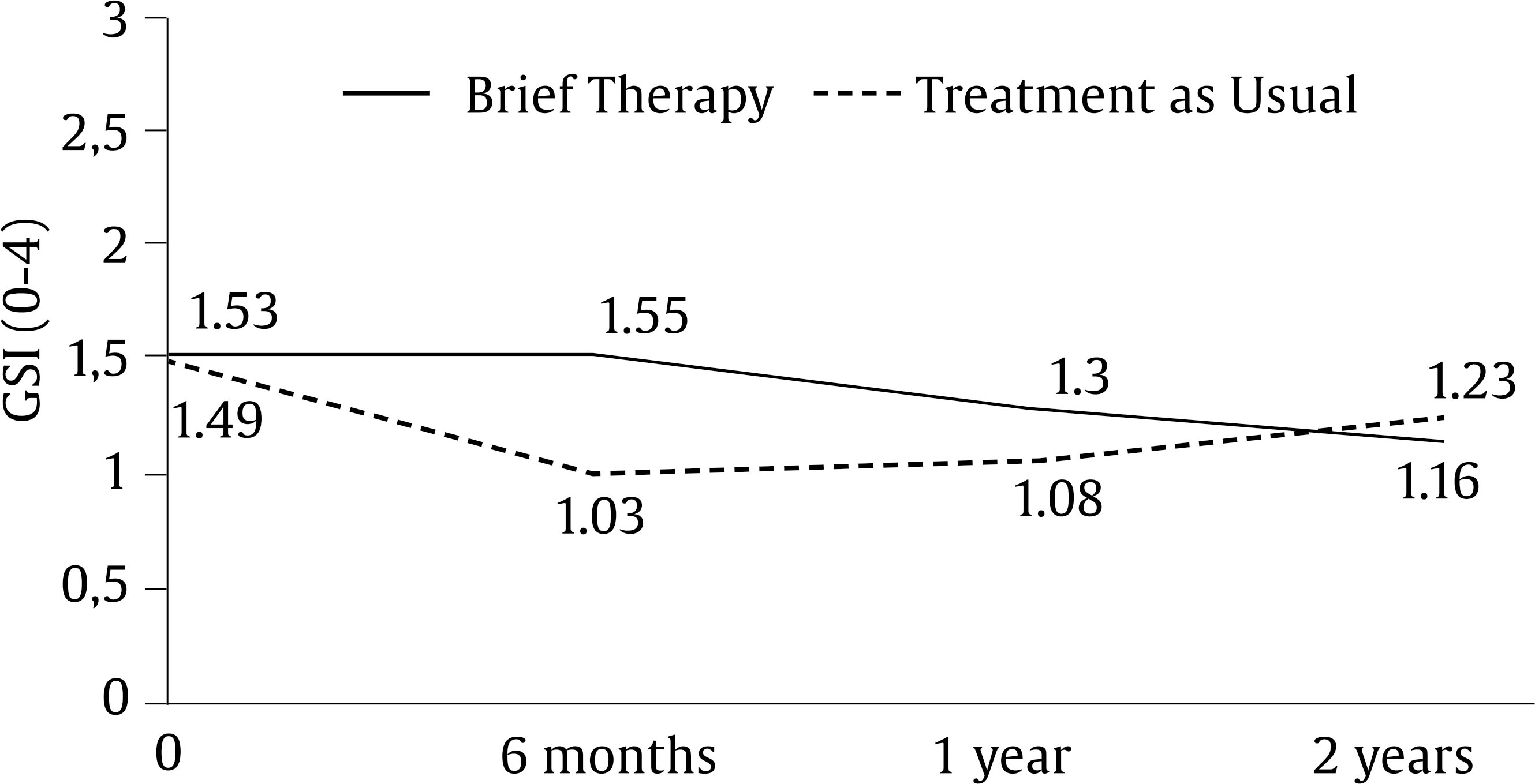 The profiles of the 6 therapists in the brief therapy group were as follows: 5 clinical psychologists and one psychiatrist, 4 men and 2 women. The average age was 42.15 (SD = 9.3), with 16 years of experience (SD = 8.7) and an average of 745 hours of psychotherapy training (SD = 374). The predominant theoretical approach was systemic-eclectic. Prior to the start of the research, therapists-researchers were trained in the psychotherapy script through seminars, and case-monitoring sessions lasting 45 hours. A distinguishing feature of this trial was that all the therapists belonged to the MHCs and were not external professionals with highly specific training in the treatment model to be implemented.