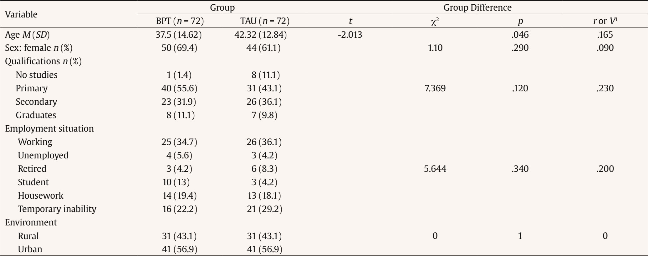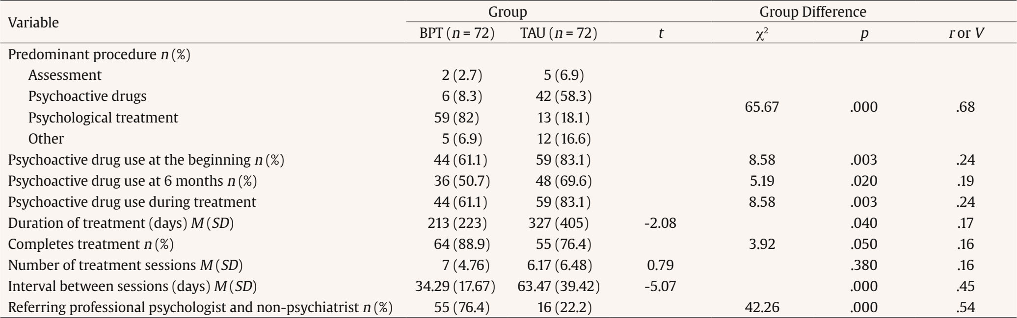 Participants received two types of treatment: TAU and BPT. Interventions were developed in person, which possibly facilitated a faster change in the people attended, compared to other modalities, such as, for example, through video conferences (Fernández-Regueras & Calero-Elvira, 2024). A more accurate description of these procedures was made a posteriori, once the variables describing the type of intervention had been recorded de facto (Table 3).