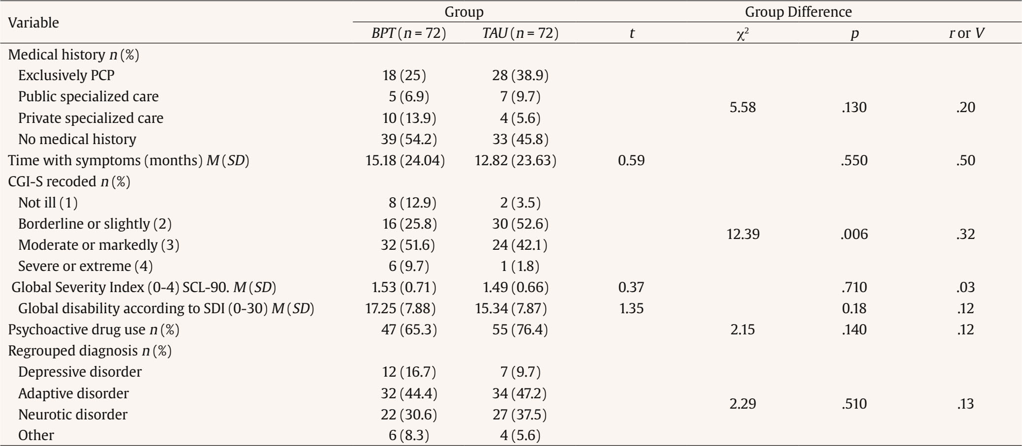 In each MHC once a week nursing staff unrelated to the research group randomly selected two subjects from among the PCP referrals that had to be assigned that day. The referrals were placed in a random order, then the nurse threw the dice twice, the first time the number determined the referral assigned to the BPT and the second time the one assigned to the TAU. Subsequently, consent was requested to participate in the research without specifying to which group they had been assigned, so subjects were blind. Pre-treatment assessments were made by a person hired by mental health services that was also unrelated to the research group.