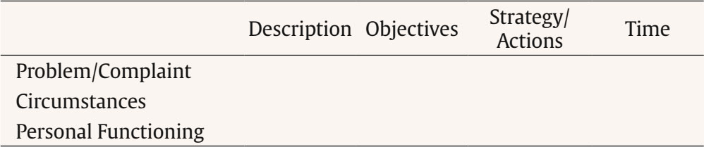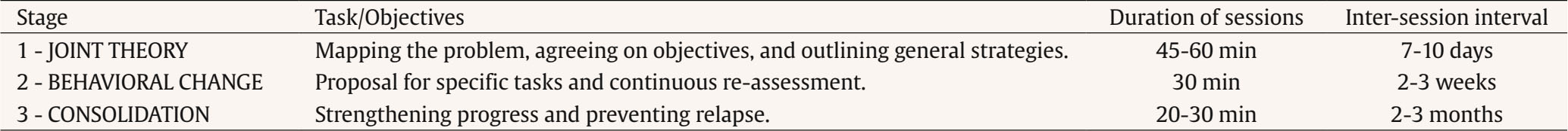Psychotherapeutic treatment is structured in three phases (Table 4) and the intersession interval is also considered a key factor in the treatment. A generic problem-objective-task definition scheme is applied (Table 5).