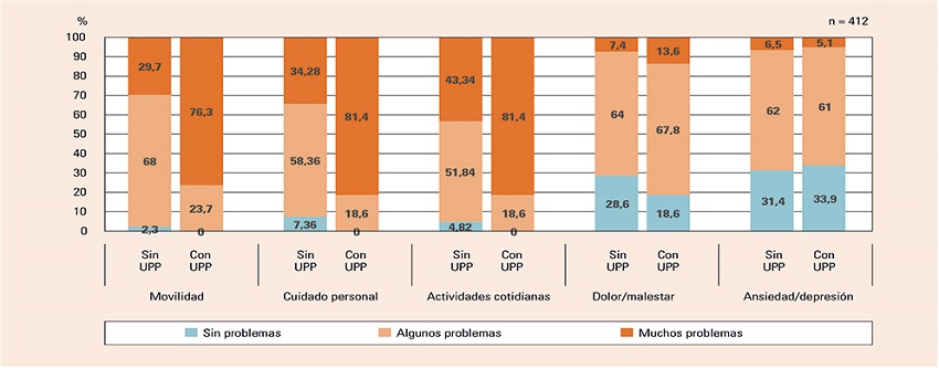 Figura 1. Presencia de problemas en las 5 dimensiones de calidad de vida del EQ-5D-3L de los participantes con y sin úlceras por presión.