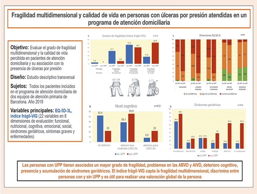 El IF-VIG es un instrumento que permite distinguir claramente entre las personas que presentan UPP y las que no las presentan. Además del manejo específico de las lesiones, las personas con UPP deberían beneficiarse de un enfoque integral de la fragilidad desde una perspectiva multidimensional. El uso del IF-VIG mejora la valoración geriátrica integral clásica, al permitir la estratificación por grados de fragilidad, convirtiéndose así en un instrumento útil para su aplicación en programas de ATDOM. Es esencial disponer de instrumentos válidos y fiables que no consuman mucho tiempo en su implementación, especialmente en entornos de atención como la APS.