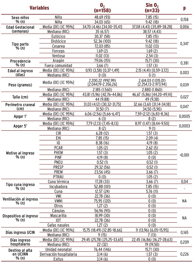 Tabla 1. Variables de recién nacidos ingresados en UCIN relacionadas con la utilización o no de oxigenoterapia.
