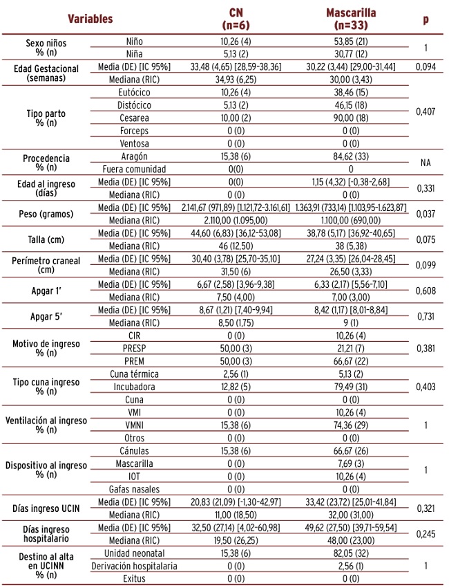 En el momento del ingreso, la media de edad de los neonatos fue de 1,14±3,75 días de vida, la media de peso de 2.271,72±1.006,42 (IC95%: 2.128,07-2.415,36) gramos, la media de talla de 44,27±6,01 (IC95%: 43,30-45,24) centímetros, la media de perímetro craneal de 31,29±4,08 (IC95%: 30,64-31,94) centímetros, la media de puntuación del test de Apgar al minuto uno y a los cinco minutos fue de 6,32±2,55 (IC95%: 5,96-6,67) y 7,99±2,08 (IC95%: 7,69-8,29), respectivamente.