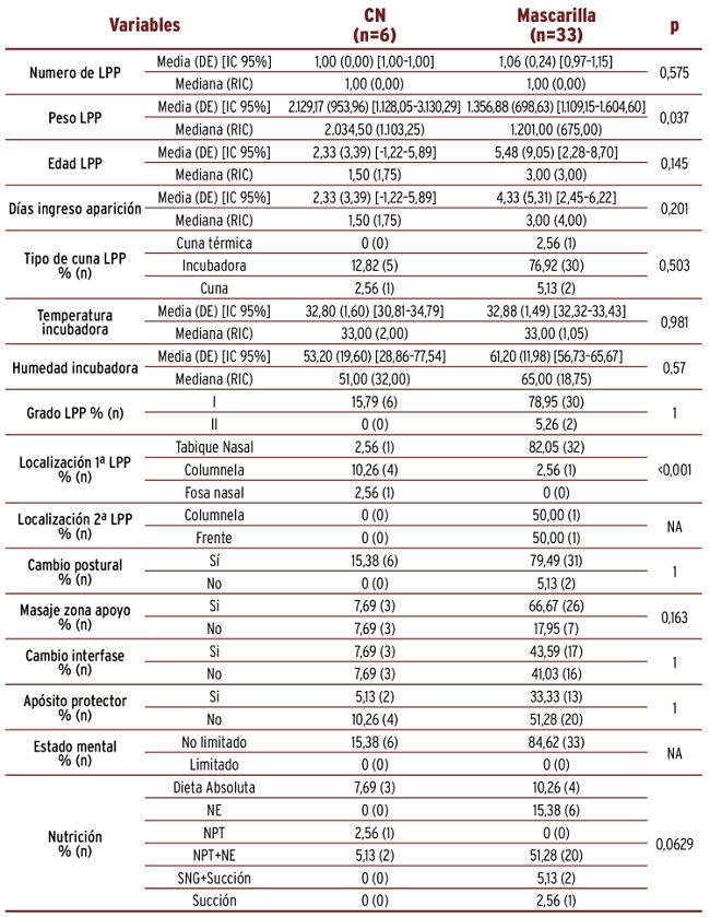 Según tipo de cuna en el momento de identificación de la LPP, el 89,74% (35) estuvo en incubadora, el 7,69% (3) en cuna normal y el 2,56% (1) en cuna térmica. Respecto a los dispositivos utilizados en ese mismo momento, el 84,62% (33) llevaba mascarilla y el 15,38% (6) cánulas nasales.