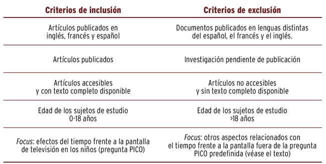 Los criterios de inclusión fueron: artículos en inglés, francés y español; sujetos de estudio con edades comprendidas entre cero y dieciocho años; artículo publicado; accesible y con texto completo disponible; y tema del estudio según la pregunta PICO. La Tabla 1 resume los criterios de inclusión y exclusión.