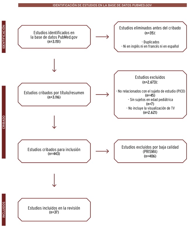 Para la revisión se utilizó el motor de búsqueda MeSH a través de los siguientes términos booleanos: (TV watching) AND (children); (SCREEN TIME) AND (CHILDREN); (SCREEN TIME) AND (CHILDREN) AND (TV) y finalmente (binge watching) AND (children). La revisión bibliográfica fue realizada por dos revisores independientes, uno de ellos con formación médica. Ambos realizaron la selección y lectura crítica de los artículos seleccionados. El investigador principal elaboró los resultados basándose en las conclusiones de la revisión bibliográfica. El periodo de búsqueda se limitó a los últimos cinco años (2017-2022).