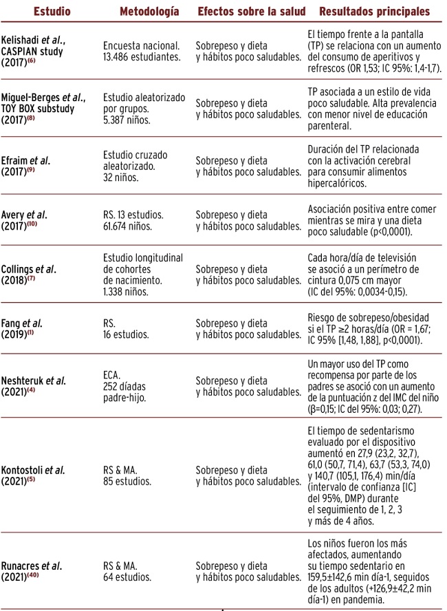 El efecto más frecuentemente observado del tiempo frente a la pantalla sobre la salud infantil fue la obesidad. Varios estudios han encontrado una relación proporcional entre el tiempo de pantalla de TV prolongado (más de 2 horas/día) y la tasa de sobrepeso y obesidad en niños (2), (4), (5). Así, el estudio de Fang et al. establece la magnitud de esta relación mediante una odds ratio (OR) de 1,67 (95% Intervalo de Confianza (IC)=1,48-1,88, p<0,0001) (1). Por su parte, una encuesta de ámbito nacional iraní, el estudio CASPIAN, relacionó el tiempo frente a la pantalla de televisión, junto con el uso del ordenador durante el tiempo de ocio, con hábitos dietéticos inadecuados vinculados a un exceso de peso en niños y adolescentes: OR de 1,53 (IC 95%=1,4-1,7) (6). Cada hora al día de ver la televisión se ha asociado con un perímetro de cintura 0,075 cm mayor (IC 95%=0,0034-0,15) (7). Algunos estudios han mostrado una relación entre el tiempo frente a la pantalla y la ingesta de alimentos hipercalóricos, incluidas las bebidas azucaradas (8). El tiempo sedentario frente a la pantalla se ha asociado con una inhibición de respuesta significativamente disminuida y un patrón de activación cerebral invertido ante imágenes de alimentos hipercalóricos e hipocalóricos en comparación con el juego activo (9). En general, comer viendo la televisión se ha relacionado con una peor calidad de la dieta de los niños y un mayor consumo de bebidas azucaradas y alimentos hipercalóricos (10) o snacks(7). El abuso del tiempo frente a la pantalla por parte de los padres como mecanismo de recompensa con sus hijos se ha relacionado con un aumento de la puntuación Z del índice de masa corporal (IMC), demostrando en el mismo estudio una reducción del IMC cuando se lograba una reducción del tiempo frente a la pantalla (β=-0,16; IC 95%=-0,30;-0,01) (4).