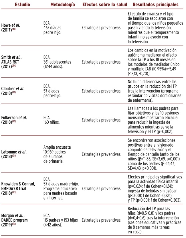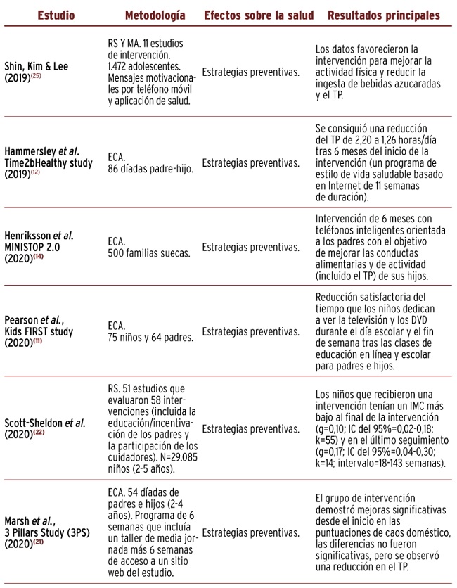 Las estrategias preventivas que pueden intentar reducir un tiempo frente a la pantalla excesivamente prolongado se asociaron a menudo con otras medidas de promoción de la salud entre la población infantil y adolescente. Muchos de los estudios que pasaron por alto esas medidas utilizan el tiempo frente a la pantalla como medida objetivo de sus intervenciones. Uno de esos estudios fue el Kids FIRST, cuyo objetivo era fomentar una reducción del tiempo frente a la pantalla y del consumo de tentempiés en niños de nueve a once años en el Reino Unido. Se trataba de un estudio piloto desarrollado mediante actividades educativas en casa (online) y en el colegio (sesiones presenciales de treinta minutos) durante un periodo de doce semanas. Se observó un mayor efecto en la reducción del tiempo frente a la pantalla, frente a un menor efecto en el cambio de malos hábitos alimentarios(11). Con un diseño similar, pero dirigido a niños más pequeños, de dos a cinco años, el ECA australiano Time2bHealthy se basó en un programa educativo en línea de once semanas de duración sobre hábitos de vida saludables. Esta investigación mostró una reducción del tiempo frente a la pantalla de 2,20 a 1,26 horas/día tras seis meses del inicio de la intervención(12). Muchas de esas estrategias preventivas se basan en el asesoramiento directo por parte de personal especializado como enfermeras(13); sin embargo, estudios más recientes se apoyarán en nuevas tecnologías como medios audiovisuales o apps como la aplicación MINISTOP 2.0 diseñada para educar a quinientas familias suecas en hábitos saludables, utilizando la reducción del tiempo frente a la pantalla como punto final de medida de efectividad (14).