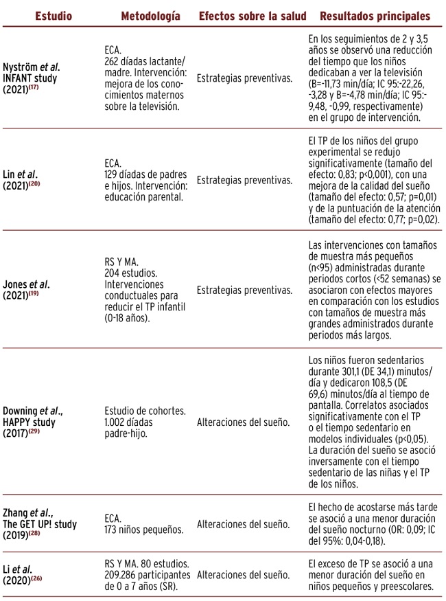 Como limitaciones de esta revisión, a pesar del número de artículos revisados, cabe señalar que la exposición a pantallas distintas a la TV puede haber interferido con los resultados, dado que algunos metanálisis han analizado la exposición a la TV junto con otras pantallas.