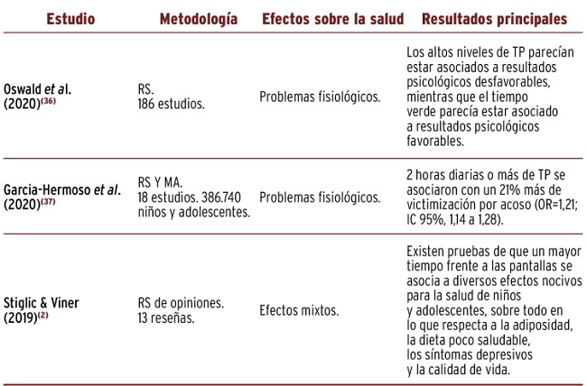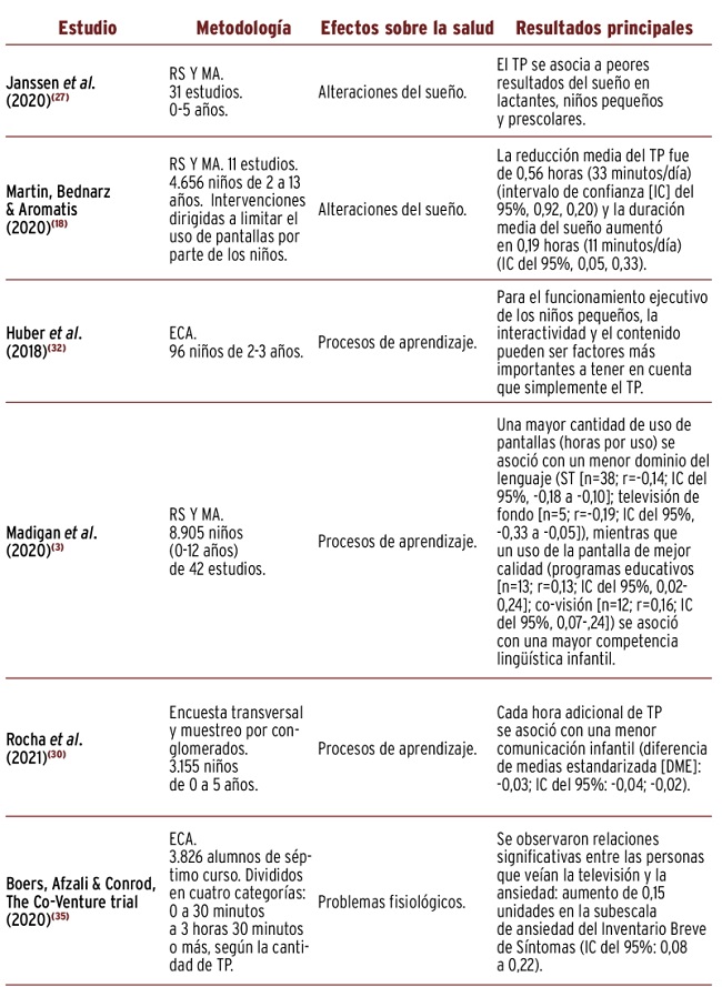 Los hallazgos de nuestra revisión están en línea con una revisión sistemática anterior de trece revisiones sobre los efectos en la salud de la exposición a pantallas en niños, incluida la pantalla de televisión, independientemente de la influencia de otros hábitos sedentarios (2). Esos autores encuentran una asociación moderadamente fuerte entre tiempo frente a la pantalla prolongada y tasas más altas de obesidad y síntomas depresivos; una asociación moderada con una mayor ingesta de alimentos energéticos, una peor calidad de la dieta y una peor calidad de vida; y una débil asociación con problemas de conducta, ansiedad, trastorno por déficit de atención e hiperactividad (TDAH), baja autoestima y nivel educativo, así como con ideación suicida, trastornos alimentarios, enfermedades cardiovasculares o asma. No encontraron evidencia que respalden un efecto beneficioso de la exposición moderada y controlada a la televisión, pero falta definir la exposición potencialmente dañina, considerando no solo la que excede un límite de tiempo establecido, sino también la que está asociada con ciertos contenidos (2).