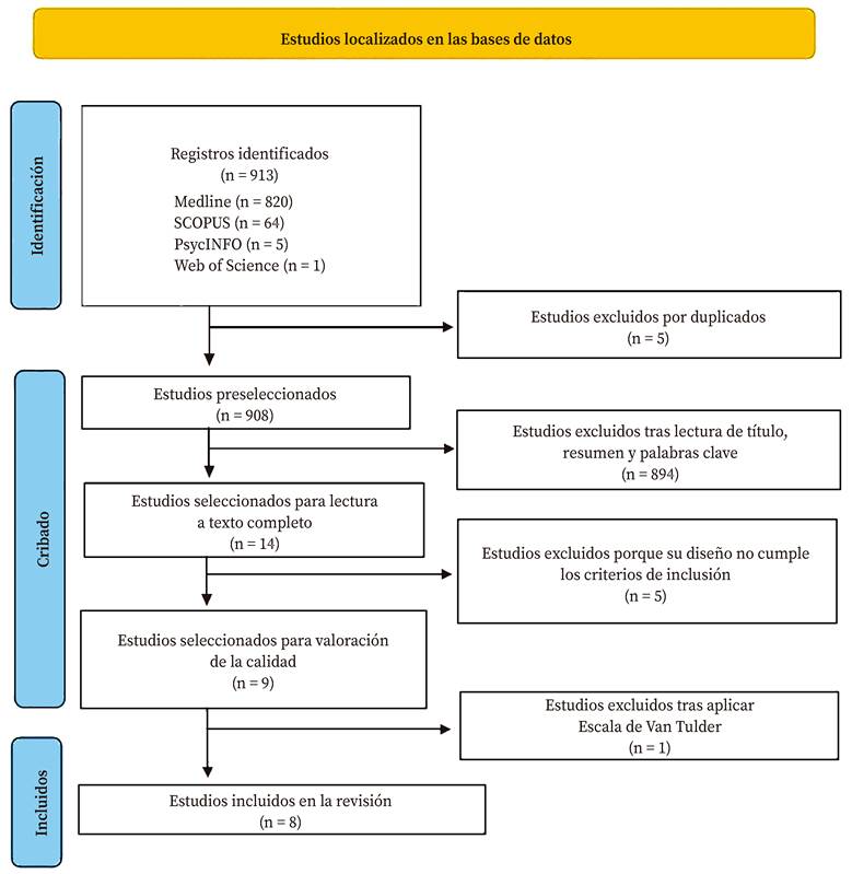 Las estrategias iniciales de búsqueda identificaron un total de 913 estudios. Tras el primer cribado se seleccionaron 14 y tras el segundo nueve; en el tercero, tras aplicar la escala de Van Tulder, se seleccionaron ocho estudios32-39 (Figura 1, Tabla 1).
