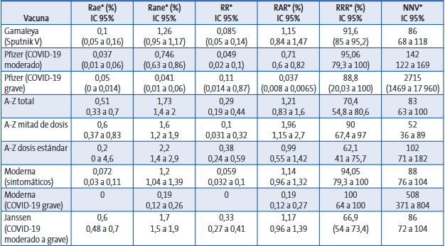 Tabla 1. Medidas de impacto absolutas y relativas de las diferentes vacunas contra la COVID-19