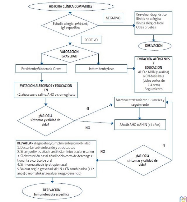 La derivación a atención hospitalaria se realizará en los casos no controlados (se debería reevaluar el diagnóstico), cuando se considere la indicación de inmunoterapia específica o con organicidad o comorbilidad asociada (otitis medias de repetición, poliposis nasal, desviación tabique nasal, hipertrofia adenoidea, síndrome de alergia oral o alergia alimentaria asociada…).