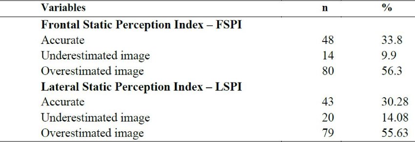 Considering that the zero value represents accurate body perception, it was possible to establish that participants were generally more accurate in their perception of static images (FSPI and LSPI) (Table I). Table 2 shows that, in more than 50% of the sample, there was a tendency to overestimate, although some subjects showed accuracy and underestimation in their body self- perception.
