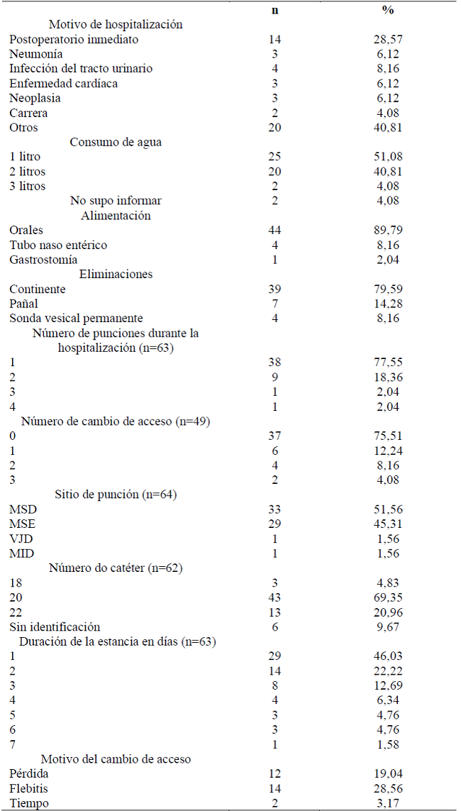 Esta investigación señala que los motivos más frecuentes de retirada de AVP son pérdida de la vena por diversos motivos, que representa el 19,4% del total de reposiciones, flebitis (3,17% del total de reposiciones), tiempo superior a las 96 horas recomendadas (3,17% del total de intercambios). Entre las variables consideradas, se destaca que el 28,57% de los pacientes con edad promedio mayor a 69,82 años necesitaron cambiar de acceso, representando el 50% de la pérdida total de accesos en el estudio.