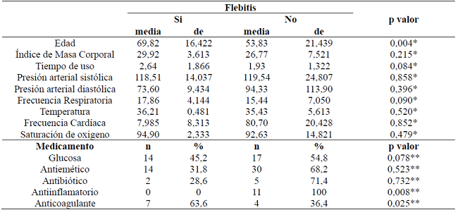 La incidencia de la flebitis en el sector estudiado fue 28,56% y los factores asociados a su desarrollo fueron la edad (p=0,004) y uso de anticoagulantes endovenosos (p=0,025). Además, los participantes que utilizaron antiinflamatorio endovenoso en la internación tuvieron incidencias menores de flebitis (p=0,008).