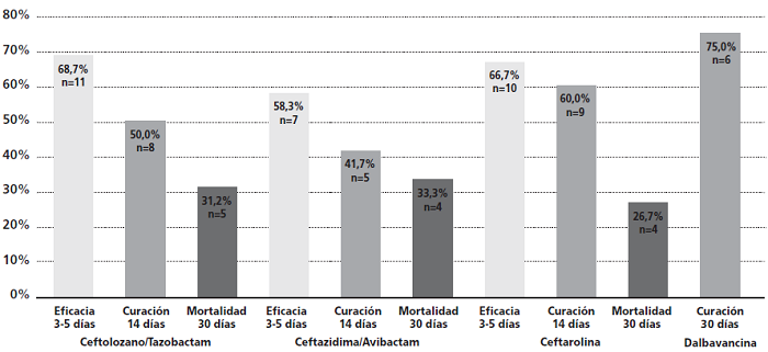 La efectividad a los 30 días en el grupo DBV la experimentaron 6 de los 8 pacientes (75%). Para el resto de antimicrobianos, el tratamiento fue efectivo de manera precoz en 28 de los 43 pacientes (65,1%). A los 14 días, 22 pacientes experimentaron curación clínica (51,2%) y 13 pacientes fallecieron a los 30 días de finalizar el tratamiento (30,2%).