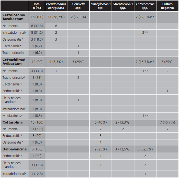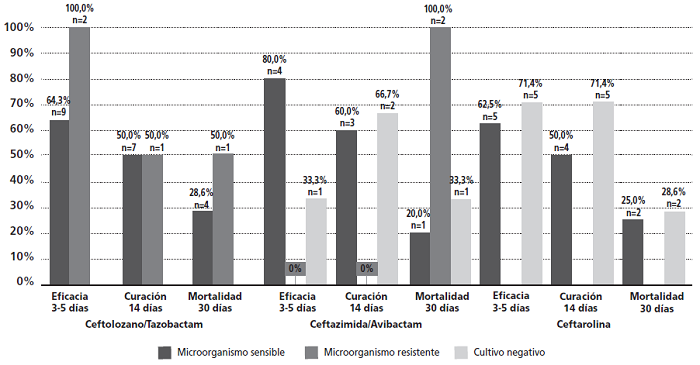 El 66,7% de los pacientes recibieron el tratamiento para una infección por microorganismos sensibles in vitro, como Pseudomonas aeruginosa tratada con C/T o Staphylococcus aureus con CTR o DBV. La sensibilidad fue confirmada por antibiograma en 8 pacientes (22,9% de los aislamientos). Un paciente con fibrosis quística colonizado por Pseudomonas aeruginosa fue tratado con C/T de manera profiláctica antes de un trasplante pulmonar. En el resto de pacientes los cultivos resultaron negativos (19,6%), se aislaron microorganismos con dudosa sensibilidad o se trataba de infecciones polimicrobianas.