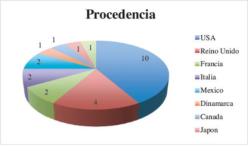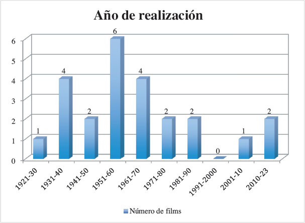 Tras una búsqueda exhaustiva localizamos un total de 24 películas, cuya procedencia, nacionalidad y año de realización se muestran en la Tabla 1 y en las figuras 1 y 2.