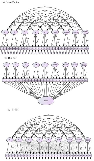 More specifically, the results of the CFA show that all dimensions of the PF-W model added significant variance. Of the four new factors added, mindset obtained the highest factor loadings, followed by environment, physical health and economic security. Finally, the results of the multigroup measurement invariance analyses have shown that there are no differences in the interpretation of the scale according to the level of education. These results demonstrate measurement invariance across the three sociodemographic groups developed and support the PF-W scale as a useful measurement tool.