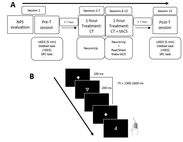Note. A: On day 1, participants underwent a comprehensive neuropsychological evaluation and the pre-treatment (pre-T) session (session 1); between 1 and 7 days after, the 1-hour treatment sessions was delivered for 12 consecutive sessions (excluding weekends; sessions 2 to 13); between 1 and 7 days after treatment, participants underwent the post-treatment (post-T) session (session 14). B: Trial procedure of the Oddball task. In each trial, a triangle, a letter or a number (target stimuli) was presented, and participants should press a button only after numbers.