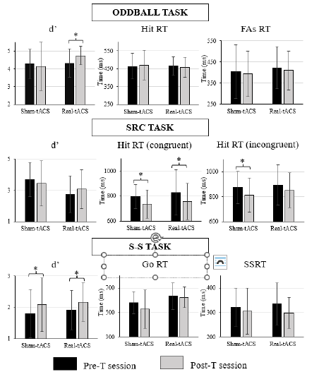 We also expected to find differences due to tACS application in the behavioural parameters obtained during the SRC and S-S tasks, as they require from attentional and WM engagement (the processes that received higher training during CCT). More specifically, we expected to find weaker effects compared to the Oddball task, as inhibition processes are central to these tasks but were only marginally included in this cognitive training (in two out of 23 activities). In effect, we observed that both groups improved in behavioural execution in both the SRC and S-S tasks, although these improvements were not significant after multiple comparisons correction. These results indicate that there were some behavioural improvements both in the quality of performance and in the speed of the responses in the cognitive tasks. These improvements might be due to the CCT effects, to a general learning effect, or to both combined effects. In any case, differences due to tACS application were not observed, indicating that while tACS enhanced the outcomes of those cognitive processes well trained during stimulation, it was not sufficient to enhance execution in less trained processes.