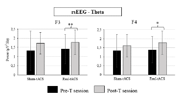 Figure 3. Theta Power at the F3 and F4 Electrode Locations Obtained in the Resting-State EEG, in Both Groups (Real-tACS and Sham-tACS)