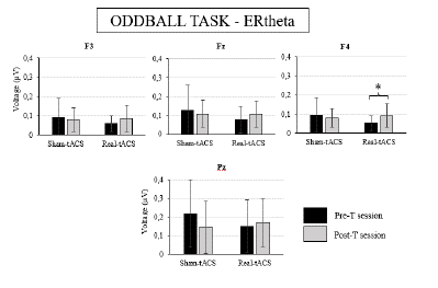 Figure 4. Bar Diagrams Depicting the Mean Amplitude of Event-related EEG Activity in the Theta Range (4-8 Hz) at the F3, F4, Fz and Pz Electrode Locations Obtained in the Oddball Task in the Pre-treatment (pre-T) and Post-treatment (post-T) for Both Groups (Real-tACS and Sham-tACS)