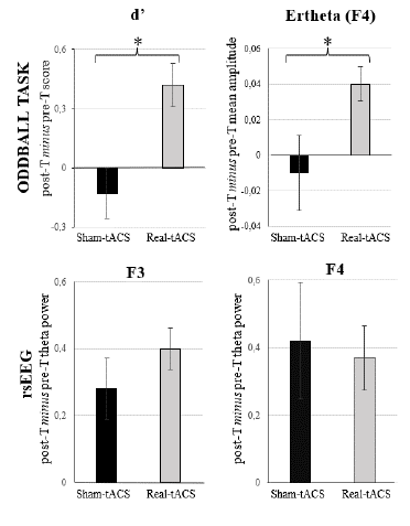 It has been suggested that online and offline tACS may induce different effects, being stronger for online protocols where neural activity synchronizes with tACS frequency (Klink et al., 2020). In this study tACS was delivered online during several cognitive tasks that engaged areas also involved in cognitive performance during the oddball task. This may explain the present results, as theta activity was significantly enhanced during the oddball task in the real-tACS group (but not in the sham-tACS group), while theta enhancements in the rsEEG (during which different networks are engaged) after treatment were present (and rather similar) in both groups, and thus do not seem to be restricted to the real-tACS participants.