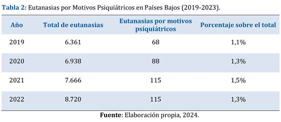 Respecto a la práctica de la eutanasia por trastornos mentales en Bélgica y los Países Bajos, la tendencia es parecida. El porcentaje de estos casos se ha mantenido constante en los últimos 20 años, variando entre el 1% y el 2% del total de eutanasias (De Hert M., et al, 2022). En la Tabla 2 se muestran los registros oficiales de la Comisión Regional de Verificación de la Eutanasia de los Países Bajos, referente a las cifras de eutanasias por salud mental entre 2019-2023.