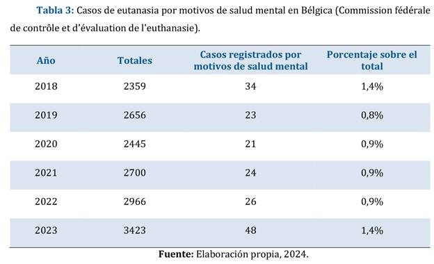 En Bélgica, los casos de eutanasia motivados por problemas de salud mental permanecen prácticamente invariables desde 2018. Y aunque haya habido un leve aumento el año 2023, tal y como la propia Comission reconoce, "siguen siendo casos marginales". Los datos se muestran en la Tabla 3.