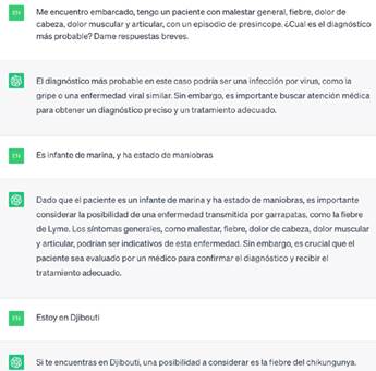 El empleo de la IA, por ejemplo, como si de nuestra medicina basada en la evidencia se tratase, podría llegar a dar soluciones algún día a problemas médicos en entornos austeros y/o aislados. Sin lugar a duda, su potencial y fácil acceso, incluso en condiciones de conectividad restringida, su ilimitado conocimiento y su capacidad de respuesta inmediata e integración, hacen a la IA un potencial aliado para la sanidad militar, donde en ocasiones el tiempo es un factor determinante. ¿Puede una IA ser el nuevo ojo clínico? ¿Es compatible el empleo de IA con la práctica clínica a la hora de aproximarse a un paciente? ¿Es ético el empleo de IA en el diagnóstico de una enfermedad? ¿Qué grado de implicación debe tener la IA en la toma de decisiones para el apoyo sanitario en combate? ¿Puede justificarse el empleo de la IA en zona de operaciones? Pongamos el siguiente caso hipotético, basado en un caso real, de empleo de la IA como herramienta de telemedicina en el ámbito de la sanidad militar: militar de veinticuatro años, infante de marina, regresa al buque tras unos días de maniobras en tierra. Pasados unos quince días, nos avisan, a las 3:30 horas, de que el infante presenta empeoramiento de su estado general, cuadro pseudogripal, entumecimiento en las extremidades, cefalea, mareos y dificultad para concentrarse. La exploración física no muestra signos de picadura. Le preguntamos a ChatGPT (figura 1). Como podemos ver, las respuestas impresionan tanto por su velocidad como por la aproximación diagnóstica. El «Dr. ChatGPT» tiene una gran base de conocimiento detrás y puede procesar peticiones de forma rápida sin las desventajas que tiene el ser humano. A raíz de esto, nos surgen una serie de cuestiones como: ¿debe el médico basar su criterio de tratamiento en el diagnóstico de ChatGPT?, o ¿es ético el empleo de ChatGPT en este caso? El empleo de la IA como herramienta de telemedicina, como en el supuesto anterior, ya se está empezando a utilizar en distintas especialidades médicas. En dermatología, por ejemplo, la IA se ha implementado a través de un software de aprendizaje profundo conocido como teledermatology. Este programa facilita la mejora del diagnóstico de lesiones cutáneas en entornos de atención primaria con el objetivo de limitar la derivación a un dermatólogo11.