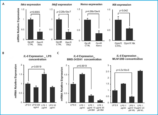 Figure 1. Silencing of NF-kβ pathway in the C3H10T1/2. A. Relative expression of targeted genes. Expression was measured 48 hours after transfection with specific GapmeRs. Absolute values were normalized vs those obtained after transfection with a control GapmeR (n = 4). B. Relative expression of Il-6 after treatment with different concentrations of LPS. Expression was measured 18 hours after growing C3H10T1/2 with LPS 0.5, 1 and 50 μg/mL to activate NFkβ pathway (n = 3). C. Relative expression of Il-6 with commercial inhibitors BMS-345541 and MLN120B in the presence of 1 μg/ml LPS (n = 3). Bars show standard deviation of mean values.