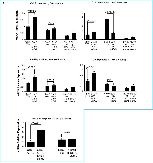 Figure 2. Relative Expression of Il-6 in silenced cells treated with LPS. Expression of Il-6 (A) or NFkB1A (B) measured 48 hours after transfection with specific GapmeRs. Representative experiment. Cells transfected with control GapmeR (GpmR Ctrl) or GapmeRs-specific for the silencing of target genes (GpmR IKKα, GpmR IKKβ, GpmR Nemo, GpmR Nik) were grown in the absence (LPS 0) or presence (LPS 1 mg/mL) of lipopolysaccharide and different inhibitors of the NF-κβ signaling pathway (BM and ML) used at a 10mM concentration. BM stands for inhibitor BMS-345541 and ML stands for inhibitor MLN120B. Graph shows values from a representative experiment. Bars show standard deviation of mean values.