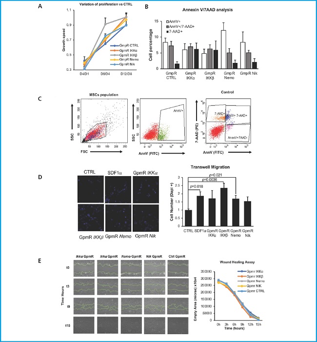 Figure 3. Evaluation of the biosafety of MSCs C3H10T1/2 cell line expressing low levels of NF-κβ key genes. A. Effect of target inhibition on cell proliferation. Results from the MTT analysis to measure the effect of target gene inhibition on cell proliferation ability. The results are expressed as the difference of each endpoint relative to the previous one (n = 2). B. Effect of target inhibition over the response to chemotactic agents. C3H10T1/2 migration capacity in response to SDF-1α. To the left, representative images of transfected cells that migrated through the transwell membrane stained with DAPI (magnification 10×). To the right, quantification of migrating cells. The number of migrating cells in each case is normalized vs the number of cells transfected with the control GpmR migrating in the absence of SDF-1α. Representative result (n = 5). C. Effect of target genes inhibition over MSCs viability. Results are expressed as the percentage of cells marked with AnnV and/or 7-AAD. AnnV+ are early apoptotic cells, AnnV+/7-AAD+ are late apoptotic cells, and 7-AAD+ are necrotic cells (n = 3). For all experiments, graph express the mean values of 5 or 3 experiments, as indicated. Bars show standard deviation of the mean values.