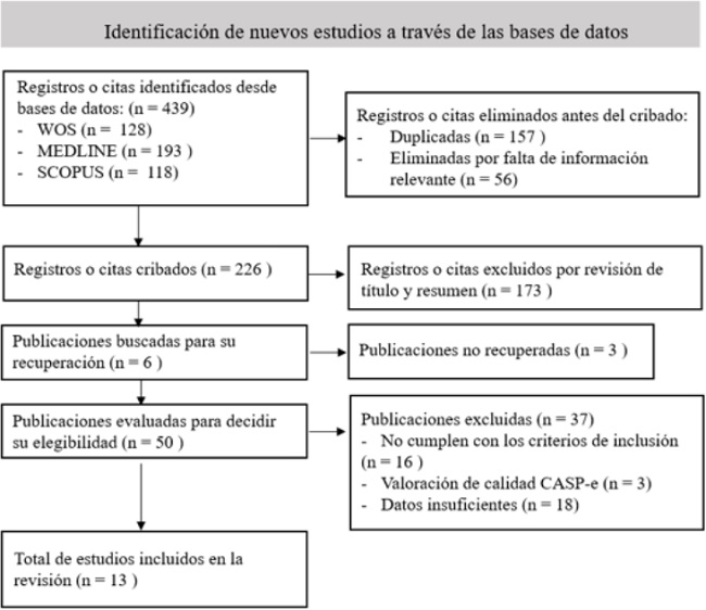 Se incluyó un diagrama de flujo según la guía PRISMA de las nuevas revisiones sistemáticas que incluían únicamente búsquedas en bases de datos y registros (figura 1) seguido desde los 439 resultados iniciales hasta los 13 estudios finalmente objeto de estudio.14