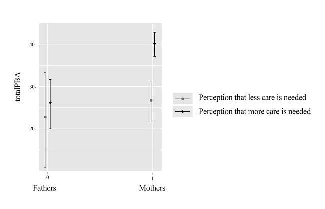 The second regression model for the second hypothesis (Table 2and 3, model 3) included the interaction between gender and the parents’ perception of their children’s need for care, using the rest of the variables as controls. The results of this interaction indicate that this relationship is partially significant (p < .1). In other words, the correlation between parents’ perception of their children’s need for care and the average parental burnout score partially depends on whether they are a mother or father. Figure 1shows this interaction, revealing differences between mothers’ and fathers’ perception of their children’s need for care and parental exhaustion scores. Thus, higher parental exhaustion values are observed in mothers who perceive that their children require a great amount of care compared to those who report that their children require little care. In contrast, no total significant differences are observed in fathers’ parental exhaustion scores, regardless of the amount of care that they perceive that their children require. The above would explain why this interaction appears to be partially significant when both groups are included, since this difference is less significant for the fathers’ scores than for those of the mothers. The R2 of this multiple regression analysis indicates that this model explains 31% of the variance, a percentage that is significant (p < .001). The regression model coefficients for this hypothesis are found in Table 3, model 3.