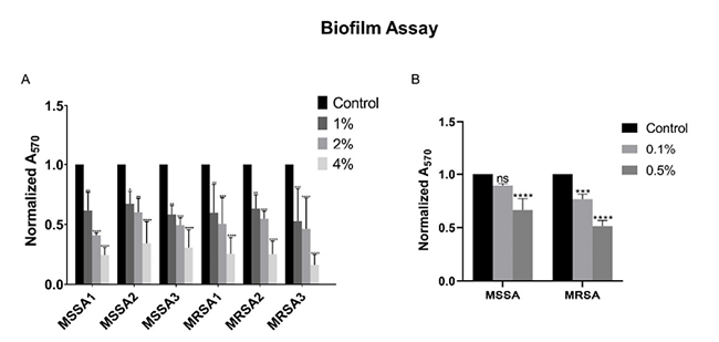 After reconfirming the antibacterial activity of FGE against MSSA and MRSA, its ability to inhibit biofilm formation at sub-MIC concentration was investigated. It was interesting to see that sub-MIC concentrations of FGE significantly inhibited the biofilm formation of both MSSA and MRSA in a dose-dependent manner (Figure 1A). In the presence of 2 and 4 % v/v of FGE, the average biofilm inhibition of MSSA strains was 50 and 70 %, respectively. In the case of MRSA strains, the average inhibition was 49 and 78 % in the presence of 2 and 4 % v/v FGE, respectively. The results indicate that FGE significantly inhibits biofilm formation by MSSA and MRSA. To investigate if organosulphur compounds of garlic are responsible for the biofilm inhibition, the biofilm formation assay was performed in the presence of 0.1 % and 0.5 % V/V of DAS. The results shown in (Figure 1B), clearly indicated that 0.5 % V/V of DAS inhibited the biofilm formation of MSSA and MRSA by 33 % and 49 % respectively. The data suggest that organosulphur compounds are most likely responsible for inhibiting biofilm formation by MSSA and MRSA.