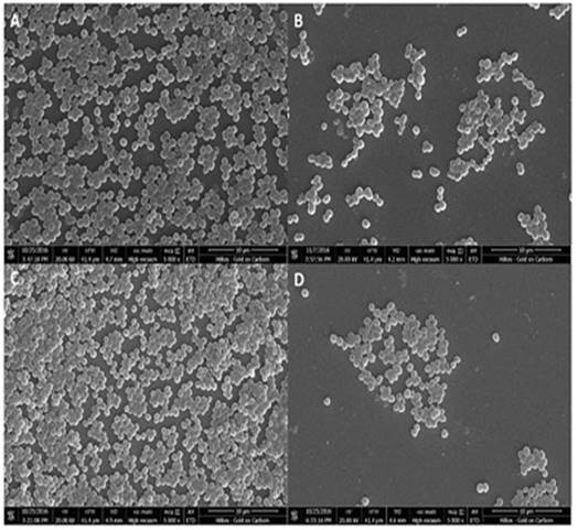 To further confirm the inhibitory effects of FGE on biofilm formation SEM analysis was performed. The SEM images clearly show a significant reduction in the number of MRSA and MSSA attached to the coverslip in the presence of sub-MIC concentration of FGE (Figure 2). The results suggest that FGE significantly reduces biofilm formation by MSSA and MRSA by inhibiting the attachment of bacteria.