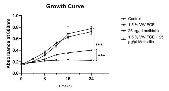 Figure 3. Growth curve analysis. Graph represents the growth of MRSA in the absence, presence of FGE and combination of FGE and methicillin as indicated in the graph. Standard deviations from triplicate experiments are indicated by errors bars and two-way ANOVA was performed to calculate the statistical significance between control and FEG + methicillin; and between methicillin and FEG + methicillin (*-P ≤ 0.05, **-P ≤ 0.01, ***-P ≤ 0.001, ****-P ≤ 0.0001).