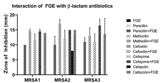 The interaction of FGE with methicillin was investigated by performing a growth curve assay. The growth curves are shown in (Figure 3); as expected there was no difference in the growth of control and 1.5 % v/v FGE, as this concentration is below MIC. The growth was slower in the presence of 2.5 μg/μl (very high concentration) of methicillin. It was interesting to see that the combination 2.5 μg/μl of methicillin and 1.5 % v/v FGE completely inhibited the growth of MRSA. This indicates that FGE was able to sensitive MRSA towards methicillin. To further investigate the interaction of FGE with other β-lactam antibiotics, ZOI experiments were performed by combining FGE (4 μl which did not show any ZOI by itself) with different β-lactam antibiotics disc (penicillin, methicillin, cefoxitin, cefepime, and cefazolin). All three strains of MRSA were resistant to the tested antibiotics with no ZOI except for MRSA2, with an average ZOI of 8 mm for cefazolin (Figure 4). However, upon adding 4 μl of FGE to antibiotics, all the MRSA strains showed ZOI as shown in Figure 3. This data indicates that FGE has the ability to sensitize MRSA strains to β-lactam antibiotics to which they were resistant before.