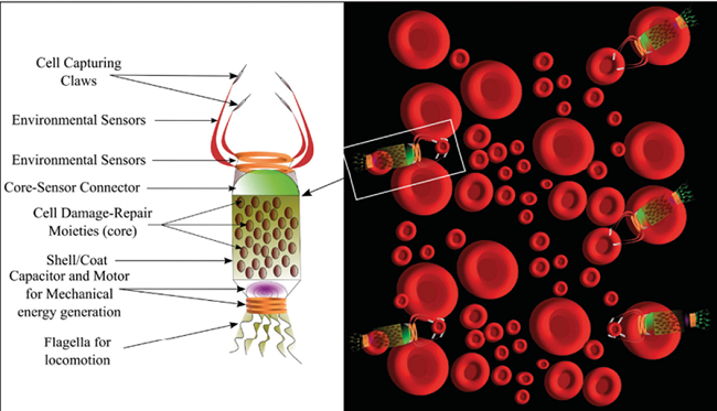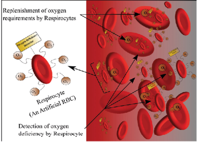 Respirocytes are microscopic mechanical devices known as nanomachines, which function at the molecular level. The diameter of each respirocyte ranges from 0.2 to 2 microns. Respirocytes have three chambers: an oxygen vessel that holds oxygen gas, a carbon dioxide vessel that stores carbon dioxide, and a water ballet that aids in buoyancy. Respirocytes serve as artificial red blood cells, transporting oxygen and carbon dioxide molecules through the blood cells. For the purpose of controlling the intake and release of carbon dioxide and oxygen, there are dedicated rotors. Additionally, a rotor permits glucose to enter the apparatus, where it combines with oxygen from the internal storage tank to provide energy needed for respirocyte function.This particular kind of nanorobot functions as an oxygen-carrying artificial red blood cell. The endogenous serum glucose provides the power. Compared to red blood cells (RBCs), these artificial cells can supply tissues with 2366 times more oxygen per unit volume and direct acidity. Figure 4 shows a respirocyte15,20.