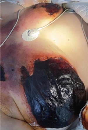 Las lesiones mamarias (Figura 2) progresaron a escaras necróticas que ocupaban su práctica totalidad, incluyendo la fascia del pectoral mayor hasta la fascia cervical y llegando hasta el hombro derecho. Se realizó escarectomía de ambas mamas con exéresis de fascia del pectoral mayor.