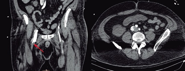 Poco después, el paciente desarrolló un cuadro de shock acompañado de hipoperfusión en la pierna derecha (según lecturas de la espectroscopía cercana al infrarrojo [NIRS] del 17% en la pierna derecha y del 59% en la izquierda). No se observaron cambios evidentes en el electrocardiograma, la ecocardiografía ni en la coronariografía. El análisis de la forma de onda de presión arterial reveló un alto gasto cardíaco, una mayor presión venosa central y un índice de resistencia vascular sistémica bajo. Una angiografía por tomografía computarizada confirmó la presencia de una fístula arteriovenosa de alto flujo entre la vena y arteria femorales derechas (figura 1; la flecha roja muestra una comunicación tubular entre los 2 vasos). Se realizó una prueba de compresión de 10 minutos (tabla 1 y figura 2) para valorar el impacto hemodinámico de la fístula en la que se observó un aumento de la presión arterial media, una disminución del gasto cardiaco y de la integral velocidad/tiempo a nivel del tracto de salida del ventrículo izquierdo, y una reducción significativa de la saturación venosa central de oxígeno.