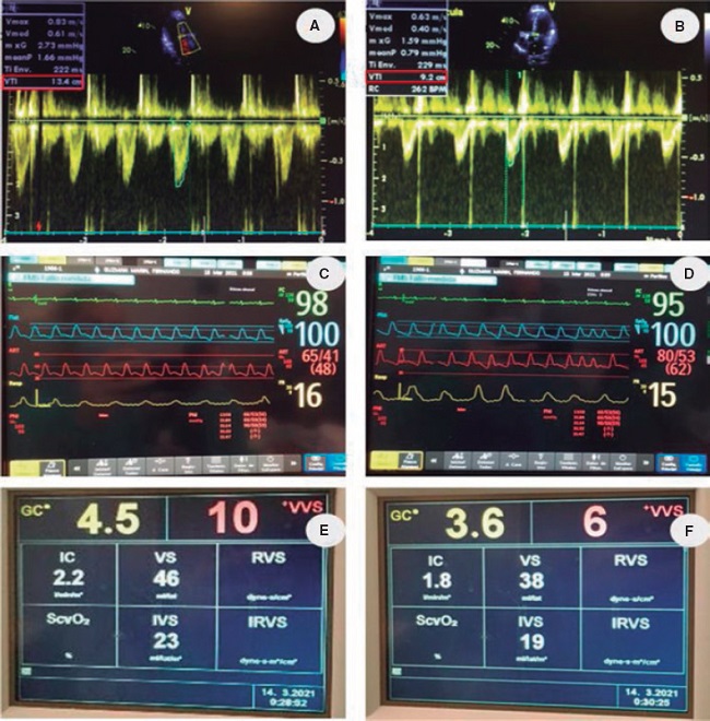 PAM: presión arterial media; GC: gasto cardíaco; IC: índice cardíaco;PVC: presión venosa central; TSVI-IVT: índice velocidad-tiempo en tracto de salida del ventrículo izquierdo; VTDVD: volumen telediastólico del ventrículo derecho; TAPSE: excursión sistólica del anillo tricuspídeo; SvO2: saturación venosa central de oxígeno; PpaO2: presión parcial arterial de oxígeno.