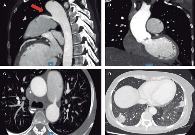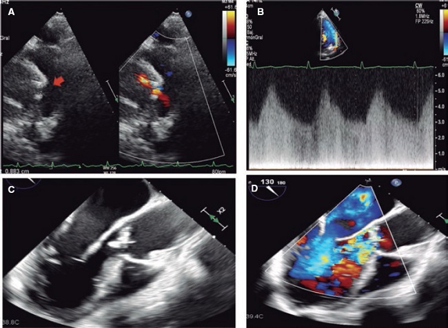 Mujer de 52 años que ingresó por ictus isquémico tratado con trombectomía mecánica. Refería fiebre durante el mes previo y en la exploración destacaba un soplo continuo sistólico-diastólico. Se le realizó un ecocardiograma que evidenció ductus arterioso persistente de 7 × 5 mm con repercusión hemodinámica (sobrecarga de cavidades izquierdas) (figura 1A,B, flecha; vídeos 1 y 2 del material https://doi.org/10.24875/RECIC.M23000427adicional). Se detectó además una verruga sobre la válvula aórtica, con ligera insuficiencia. En hemocultivos se aisló Streptococcus sanguinis. La angiografía de tórax por tomografía computarizada, además de caracterizar el ductus, mostró una vegetación sobre el tronco pulmonar con embolias sépticas pulmonares (figura 2A-D, flecha). Se pautó tratamiento antibiótico por 4 semanas. Ante el empeoramiento ecocardiográfico (crecimiento de vegetación y progresión de la insuficiencia) (figura 1C,D; vídeos 3 y 4 del material adicional https://doi.org/10.24875/RECIC.M23000427adicional) se decidió intervenir quirúrgicamente para sustituir la válvula aórtica por una prótesis mecánica y cerrar el ductus con parche.